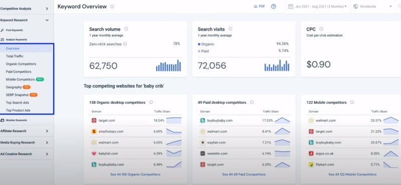 SEMrush offers comprehensive competitive analysis features, including keyword and ad copy analysis.