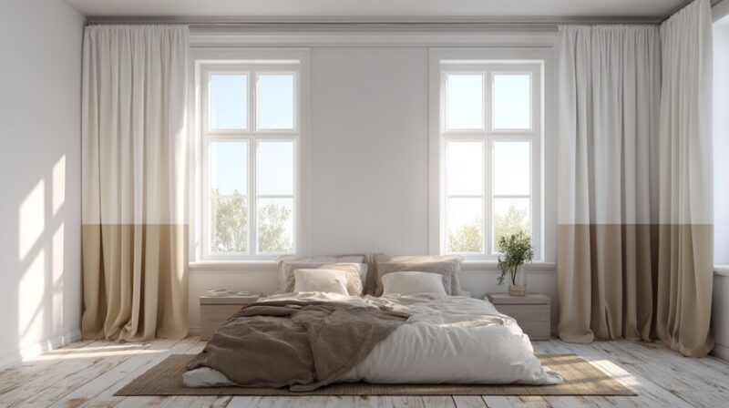 - Neutral curtains with a color band or subtle pattern
