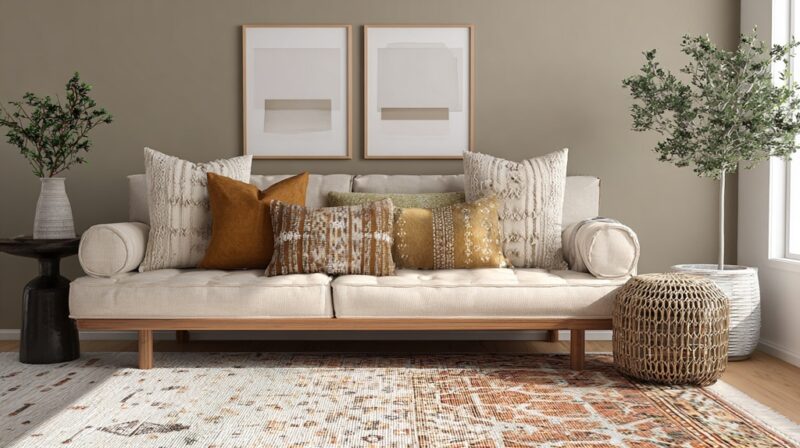 Buying smart: Choose removable covers for easy laundering and storage. Textures like bouclรฉ, slub cotton, velvet, or linen add interest even in solid colors. Warm whites and earthy mid-tones feel especially current in 2025.